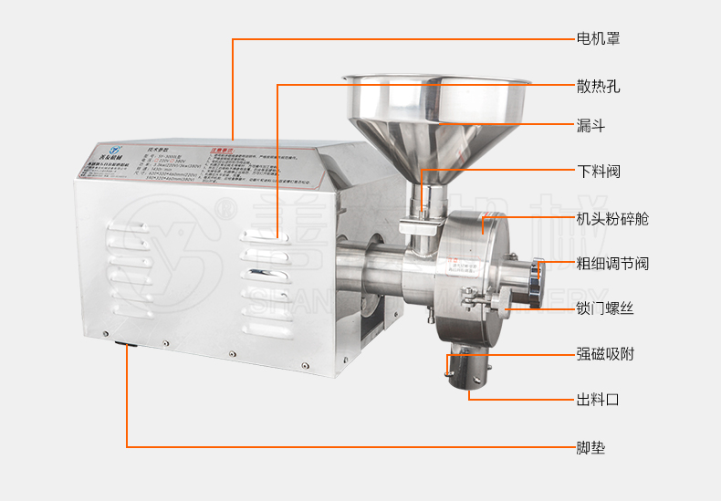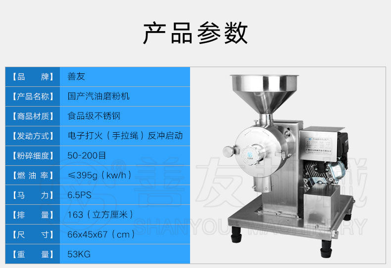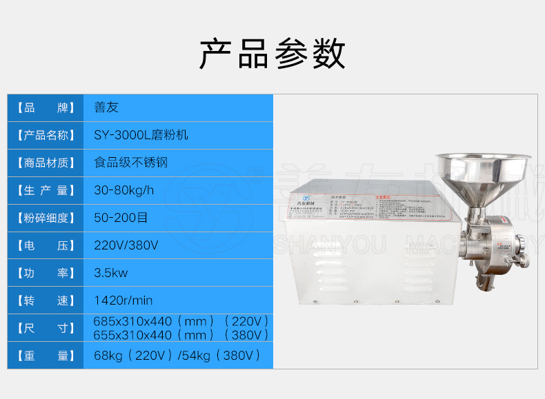 最后善友机械推出一款专业型的SY-3000L大功率五谷杂粮磨粉机,而且比较商业化,电压在220V与380V商业型的五谷杂粮磨粉机